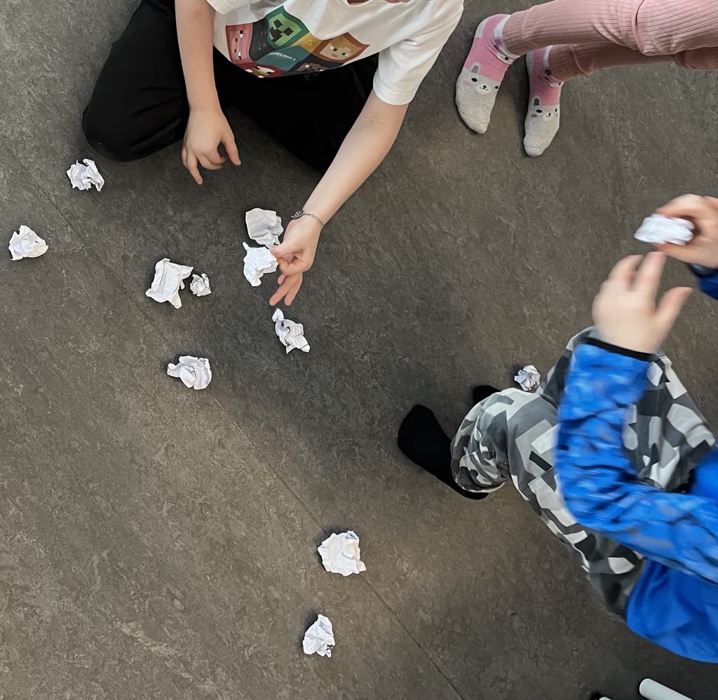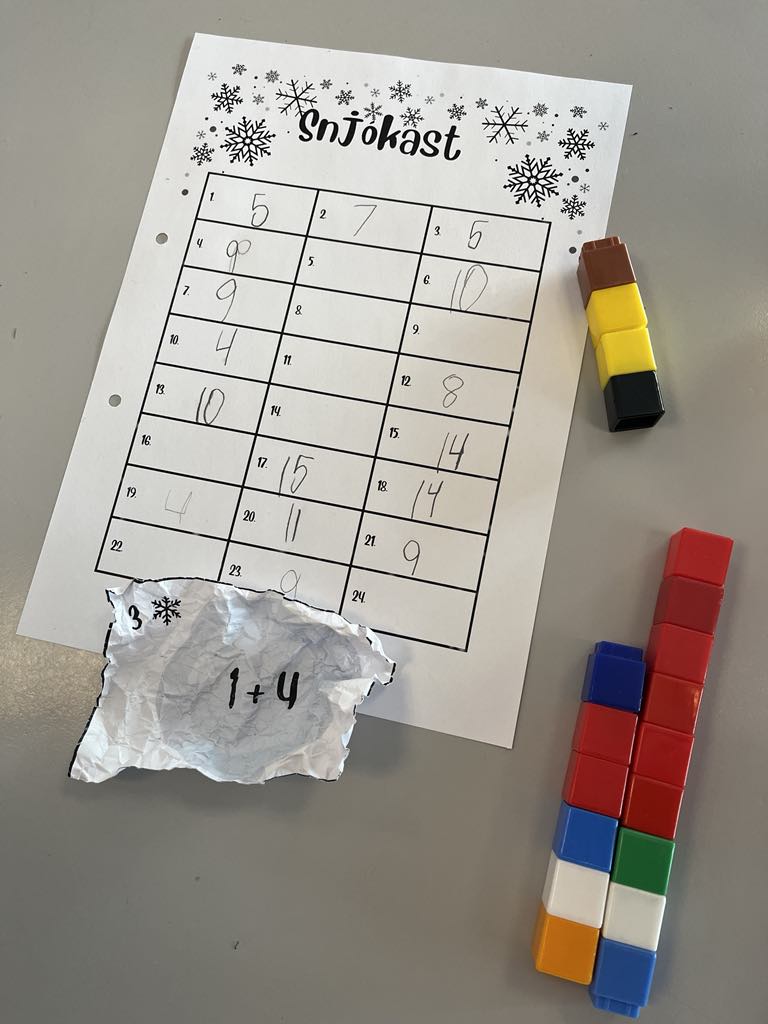 Þegar snjórinn hvarf um daginn fórum við í snjókast inn í stofunni okkar. Boltarnir eru með samlagningardæmum og krakkarnir höfðu blað til að skrá svörin við dæminum. Snjóboltarnir fóru allir í miðjuna á stofunni og öll sóttu einn bolta í einu, reiknuðu dæmið, skráðu á blaðið og köstuðu svo boltanum aftur inn í miðjuna áður en nýr bolti var sóttur. Snjóboltarnir eru með númeri í horninu og var summan á dæminu skráð í reit með sama númeri á skráningarblaðinu.