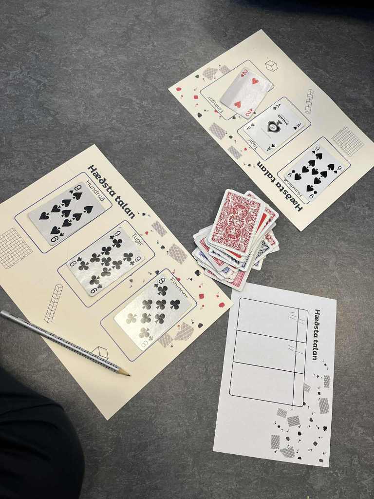 Þegar við byrjuðum að vinna með þriggjastafa tölur gerðum þetta spil sem fékk nafnið Hæsta talan. Það gengur út á það að draga eitt spil í einu til skiptist og reyna að búa til hærri tölu en spilafélagi. Til að hafa spilið skýrt og einfalt og var búið spilaborð sem spilin eru lögð niður á og einnig til hafa hugtökin hundruð, tugir og eining. sýnileg og æfa þau. Það er líka til útgáfa með þúsund, hundruðum, tugum og einingum. Spilið vakti mikla lukku og voru sum sem vildu fá það með sér heim.